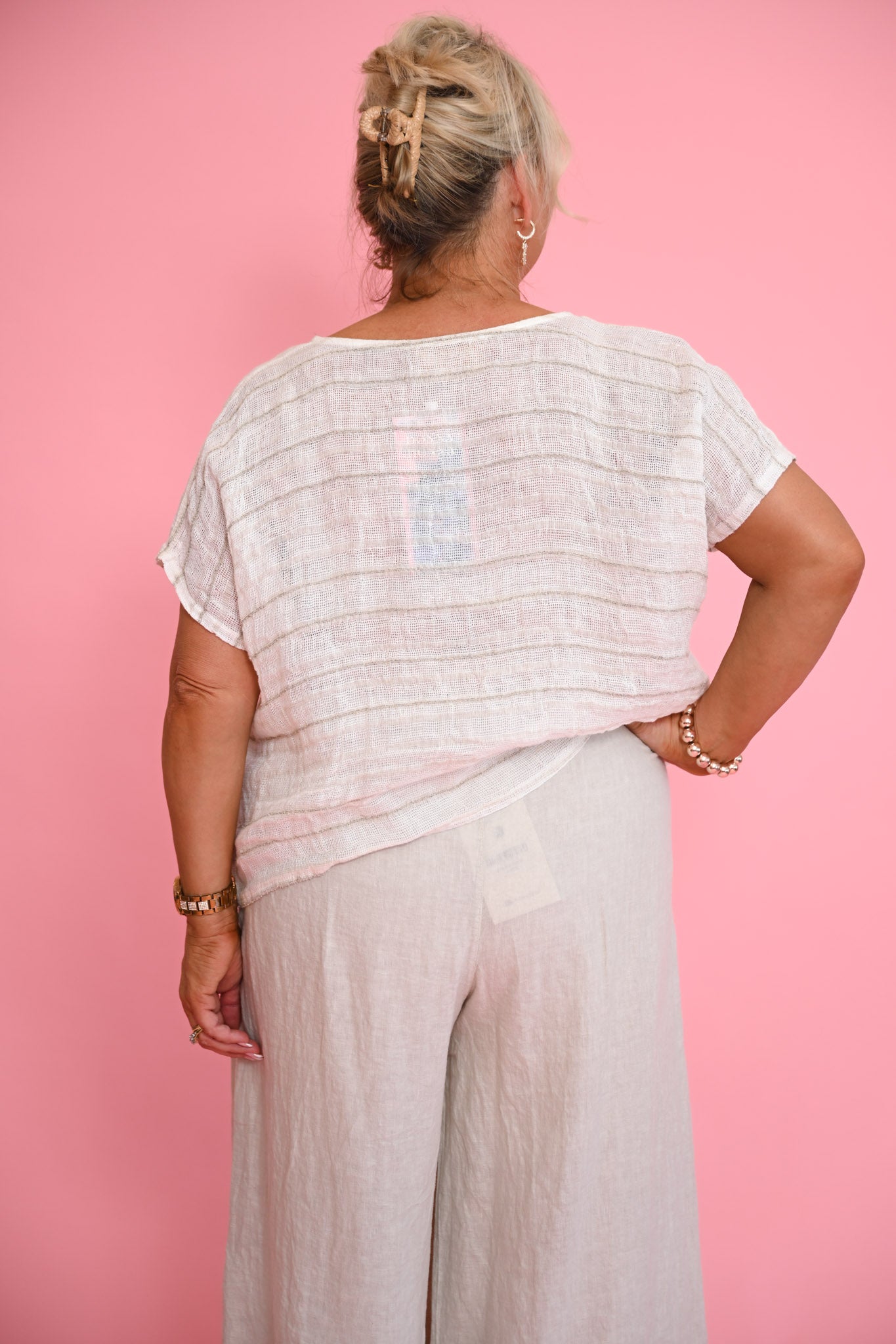 The Vittoria Top is crafted from 100% open-weave linen, offering a breathable and lightweight feel that’s perfect for warm days. In a natural beige stripe, it blends relaxed sophistication with easy wearability, making it a beautiful addition to any wardrobe. The fabric’s natural texture gives it an organic charm, while the cropped silhouette creates a modern, flattering shape.