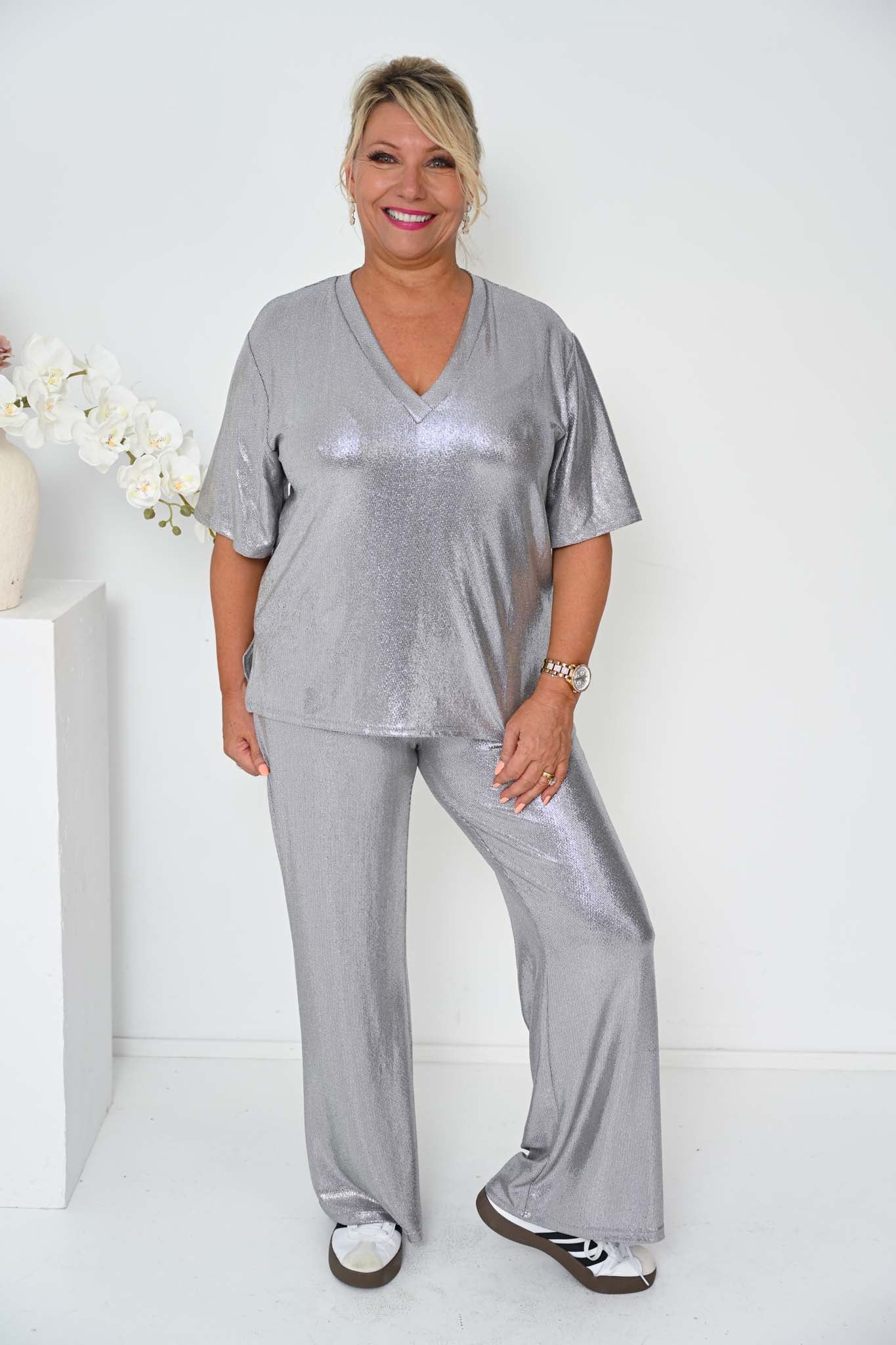 Whether styled with the matching tee for full glamour impact or paired with a simple cami or tailored blazer to let the shimmer take centre stage, the Vivid Glitter Trousers deliver effortless comfort with dazzling, head-turning appeal.