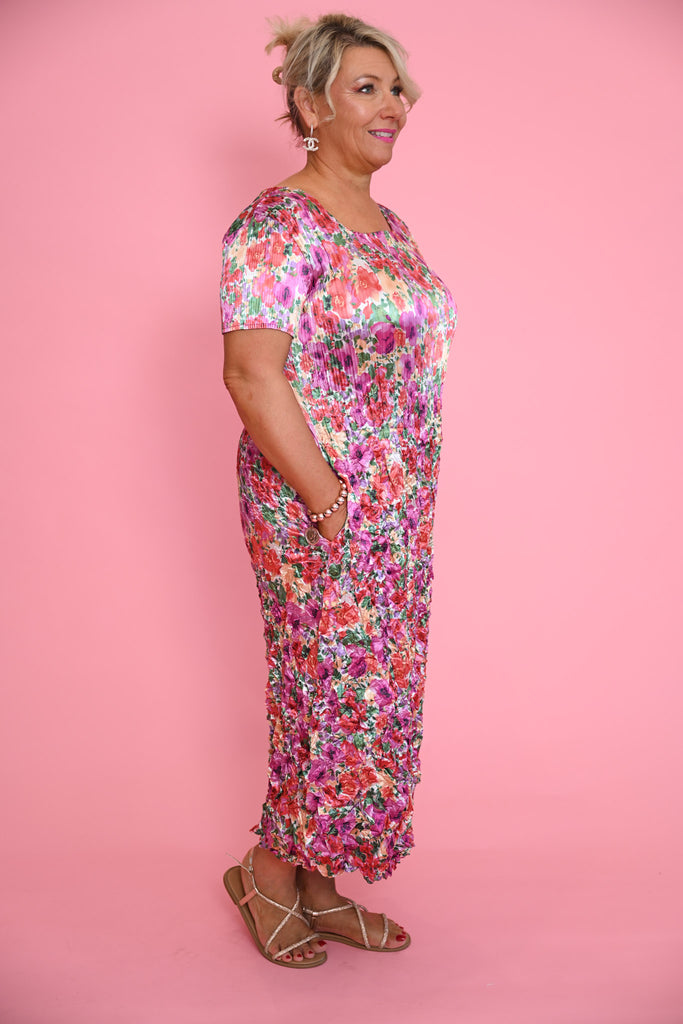 This version features a vibrant pink floral print all over, adding a cheerful, eye-catching touch to the relaxed silhouette. With a classic round neckline and short sleeves, the dress offers a comfortable fit that suits a range of sizes. Falling to the ankle, it creates a flattering, flowing shape that moves beautifully with every step.