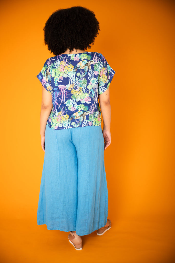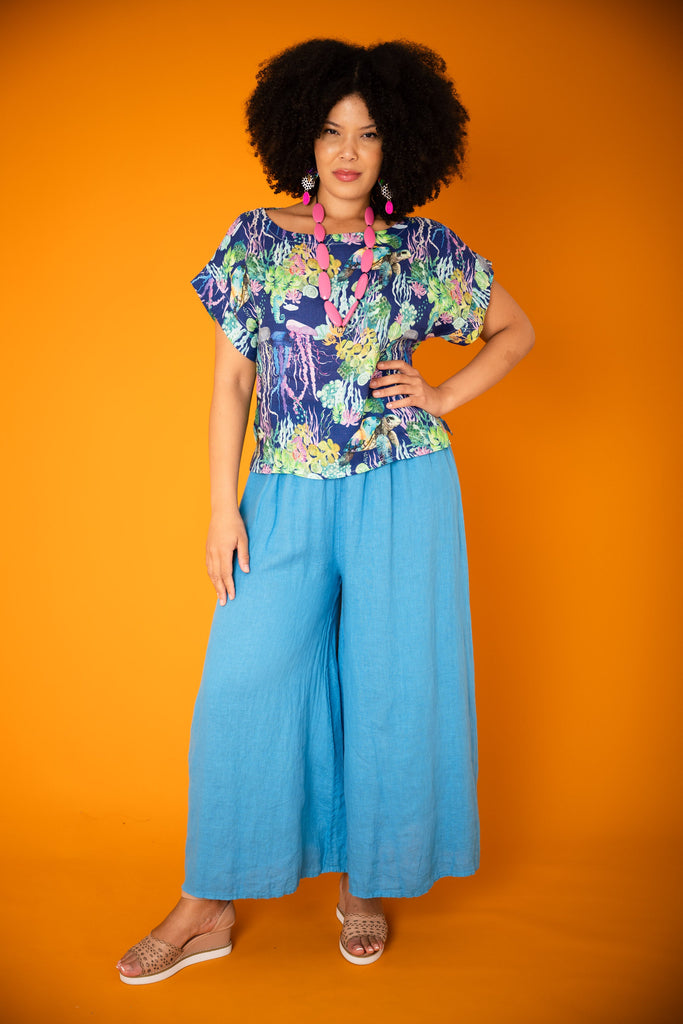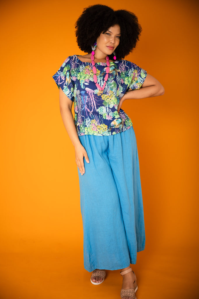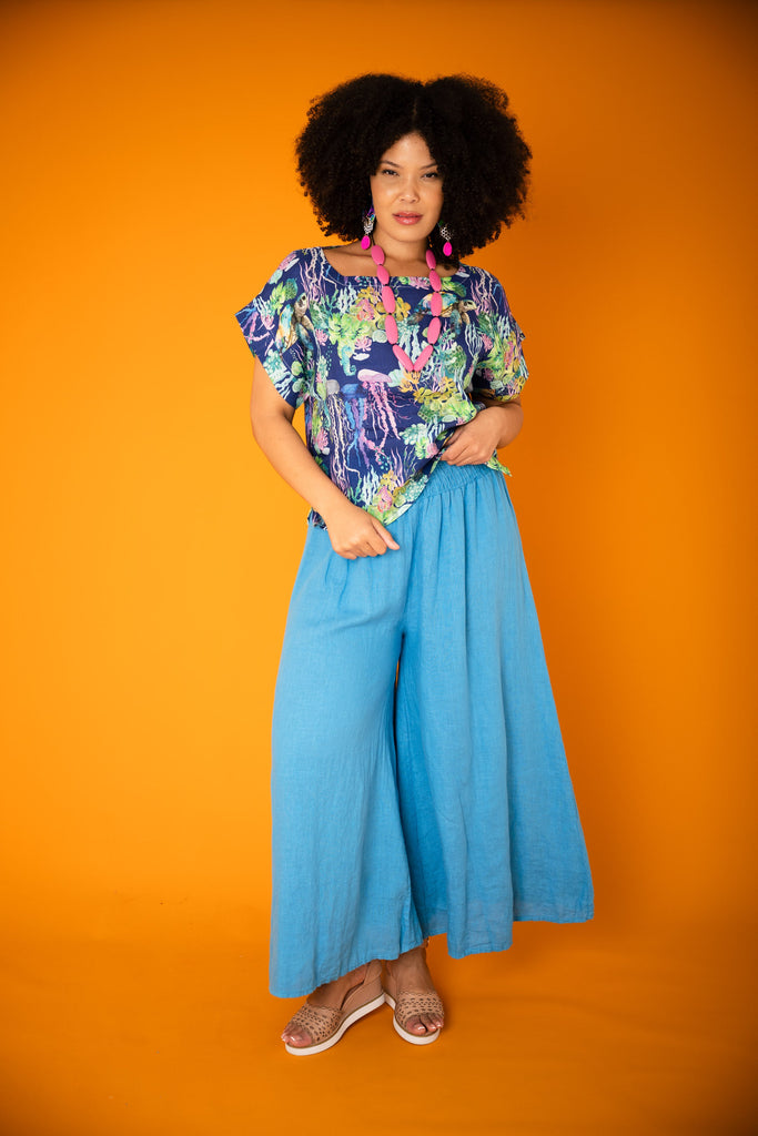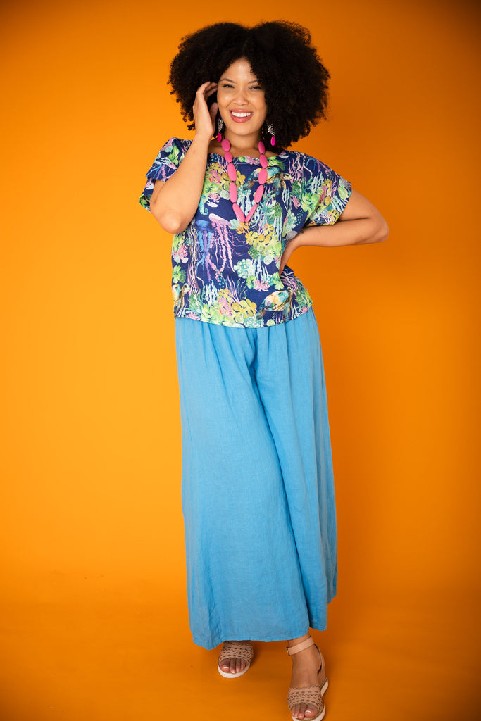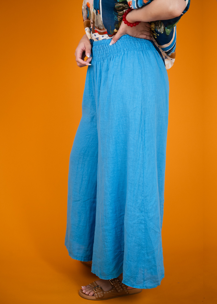 Dive into coastal elegance with the Zuri Pants in Malibu, a tranquil beauty of a stunning blue hue. Crafted for beach lovers and those who crave the carefree spirit of ocean waves. The wide-leg silhouette and thick, shirred waistband ensure comfort, while the Malibu Blue color adds a touch of serenity to your ensemble.