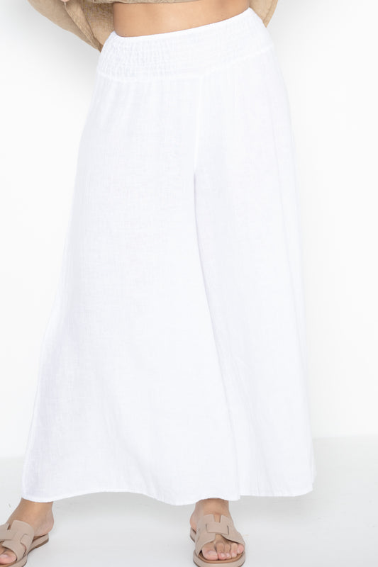 Elevate your wardrobe essentials with the Zuri Pants in clean and crisp White. These culottes offer an effortlessly elegant silhouette that's easy to style with anything in your closet. The wide-leg design and the thick, shirred waistband ensure comfort and versatility, making these pants your go-to for every occasion.